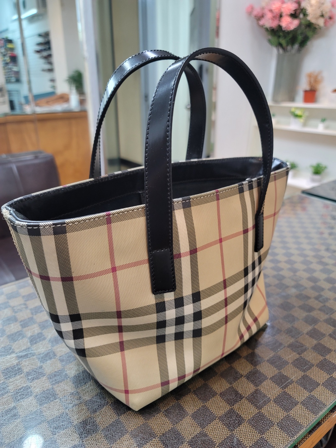 토드백 형태로 사랑스러운 시그니처 체크무늬가 돋보이는 가방입니다